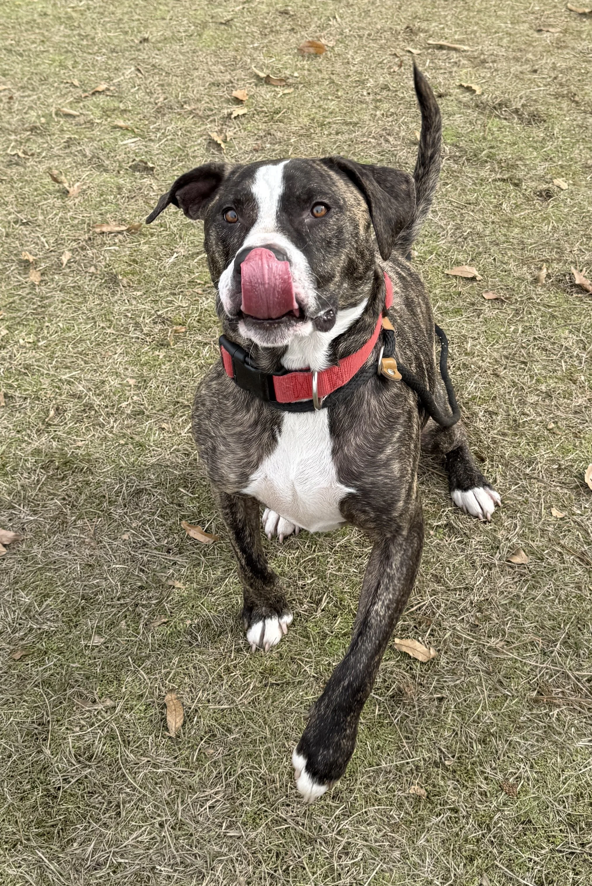 This big boy was never taught manners like walking on a leash, not barreling out of the door as soon as it opened and stay. This past summer, Kenny saw a couple of dogs being walked by their owner and as these things tend to happen, his owner was walking out the front door at that same moment. His excitement got the best of him and Kenny ran straight to those 2 smaller dogs.
